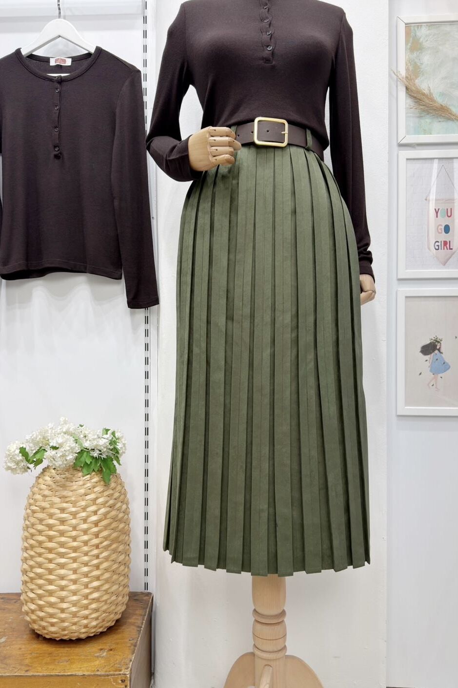 Kemer Detaylı Haki Yeşili Fallow Pileli Etek