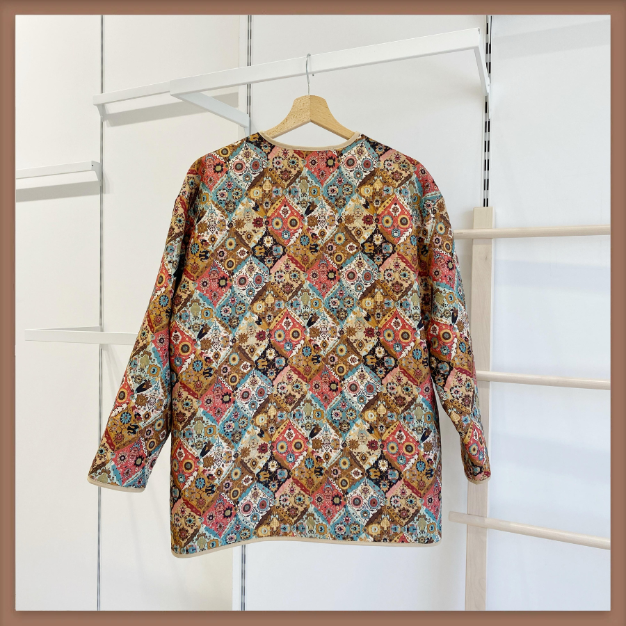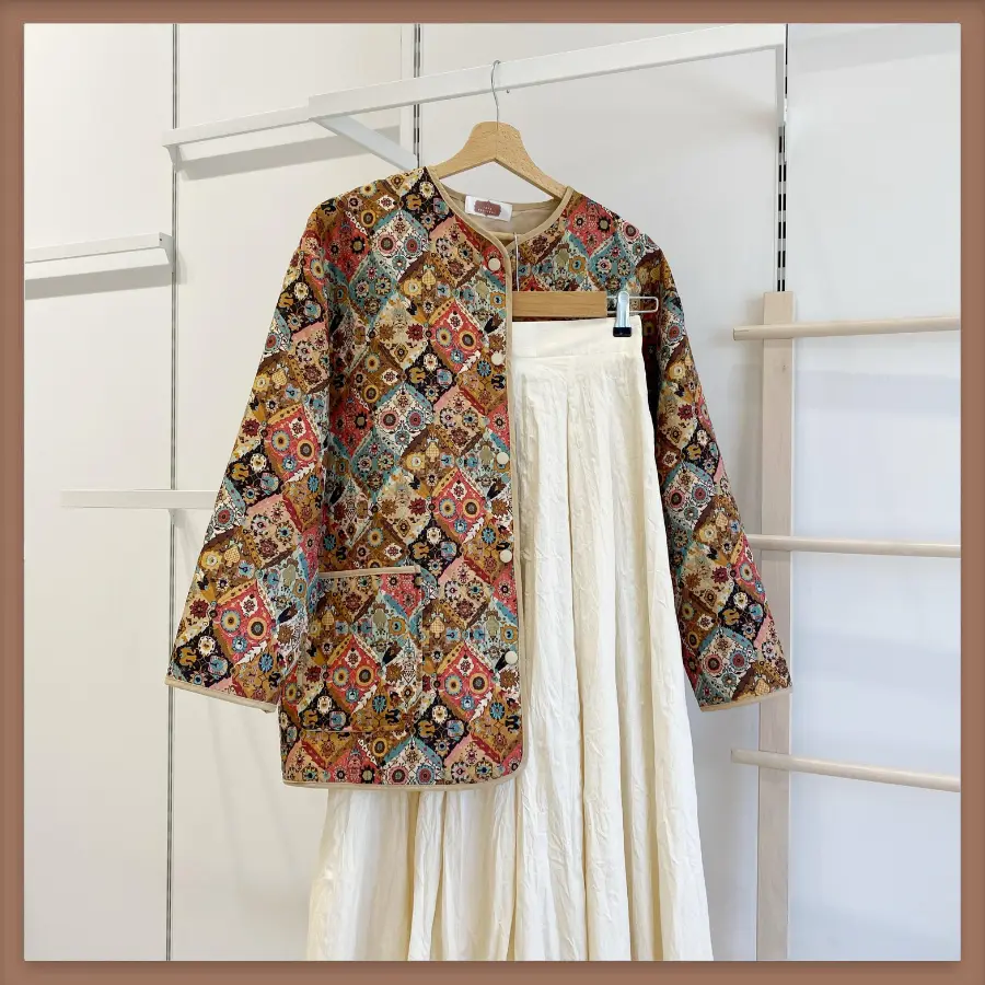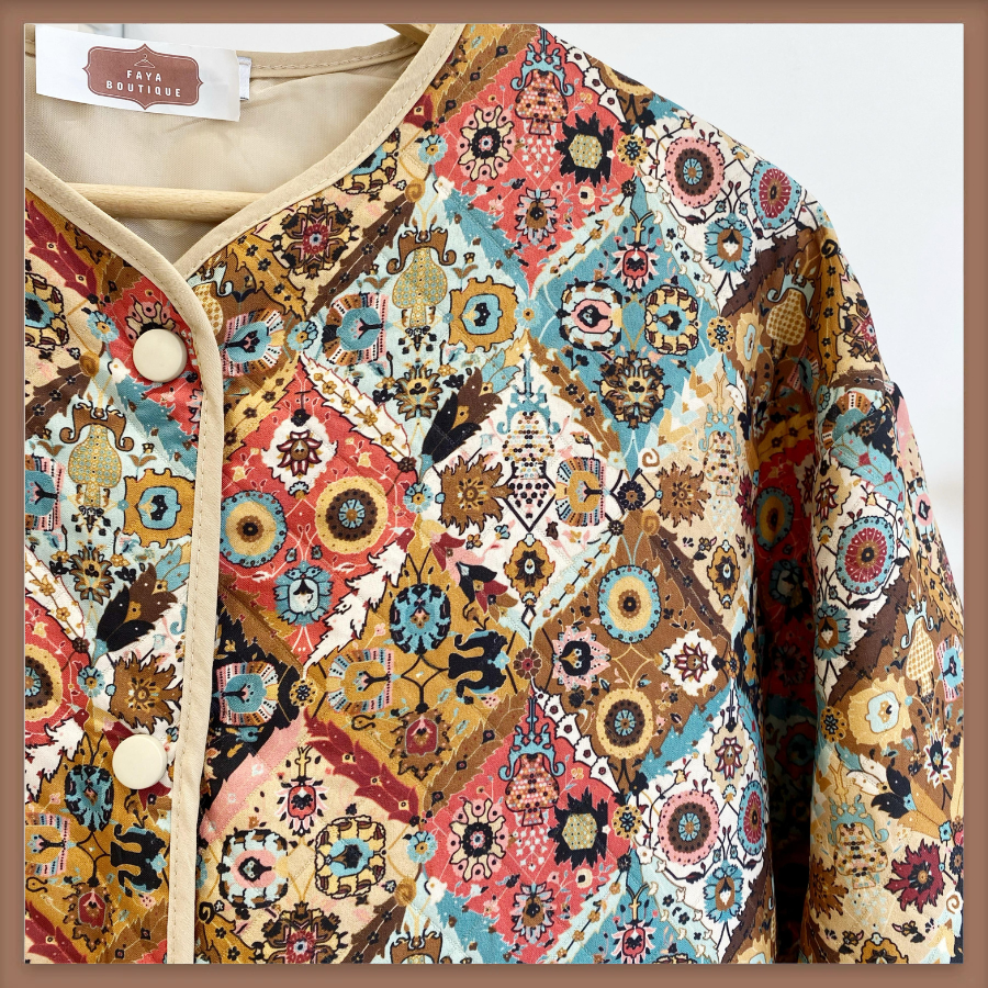 Krem Etnik Desenli Kapitone Ceket