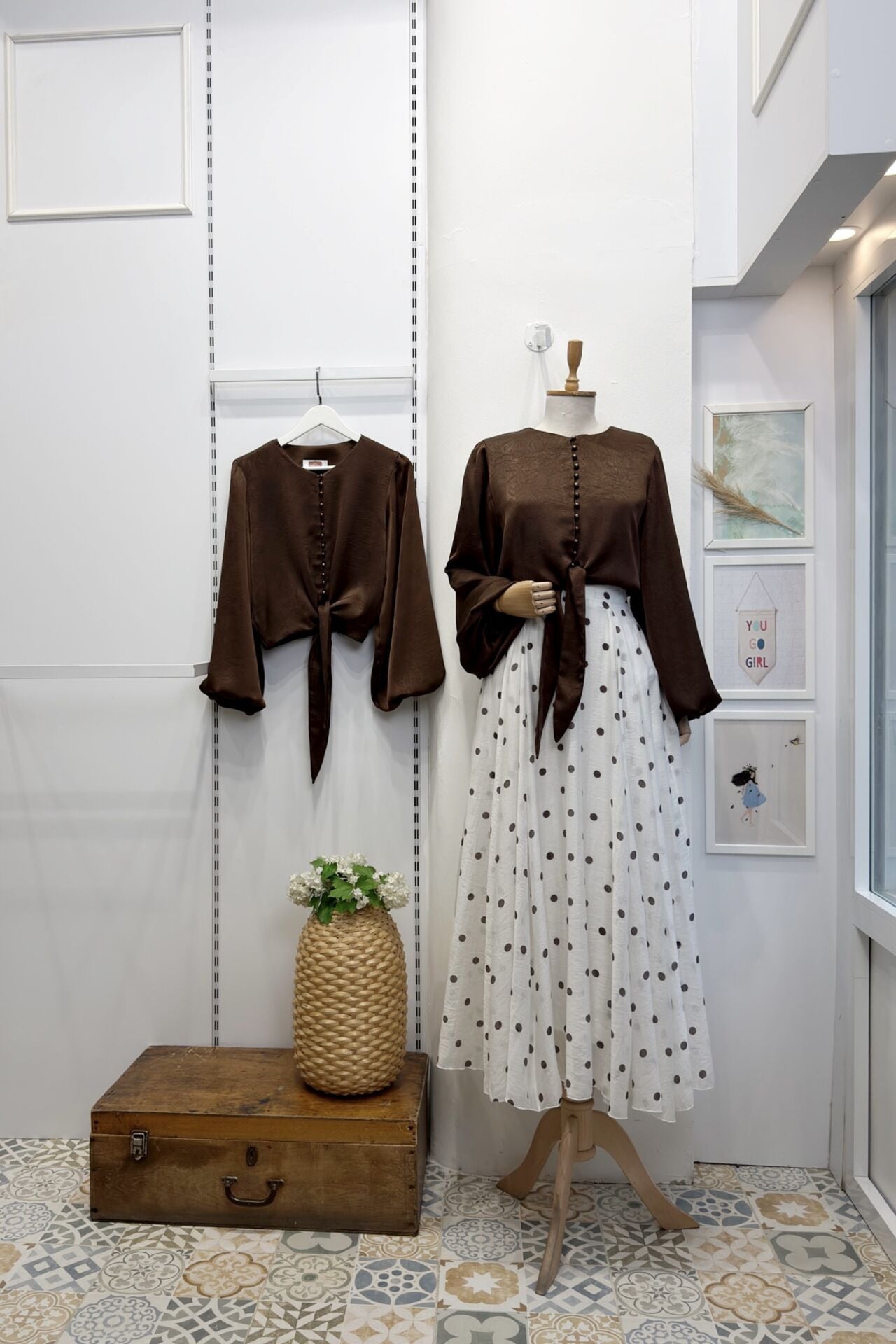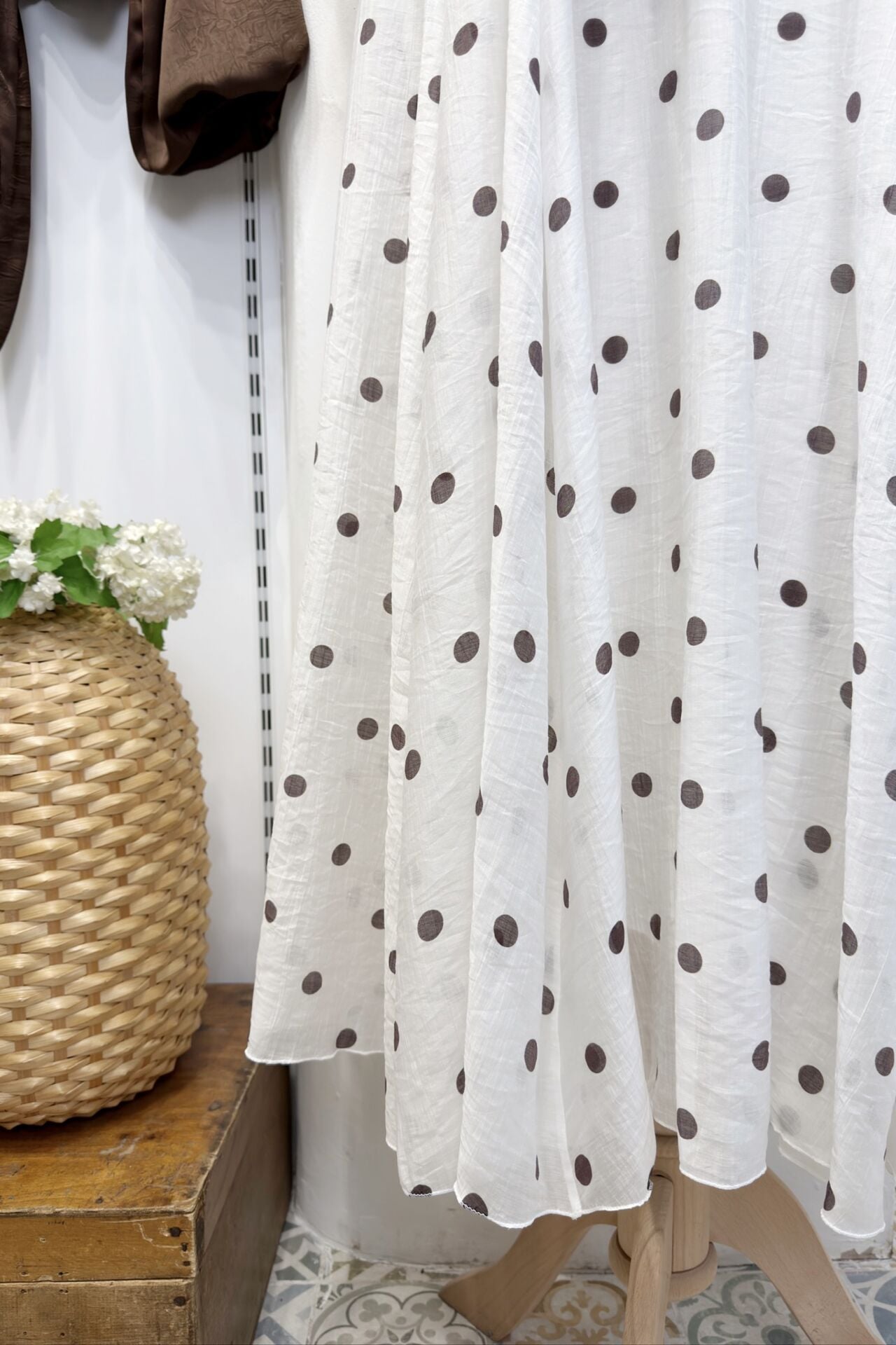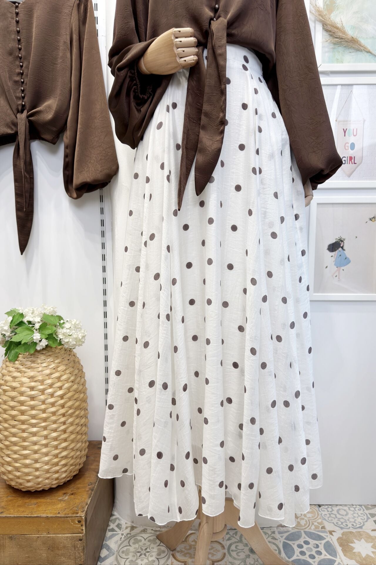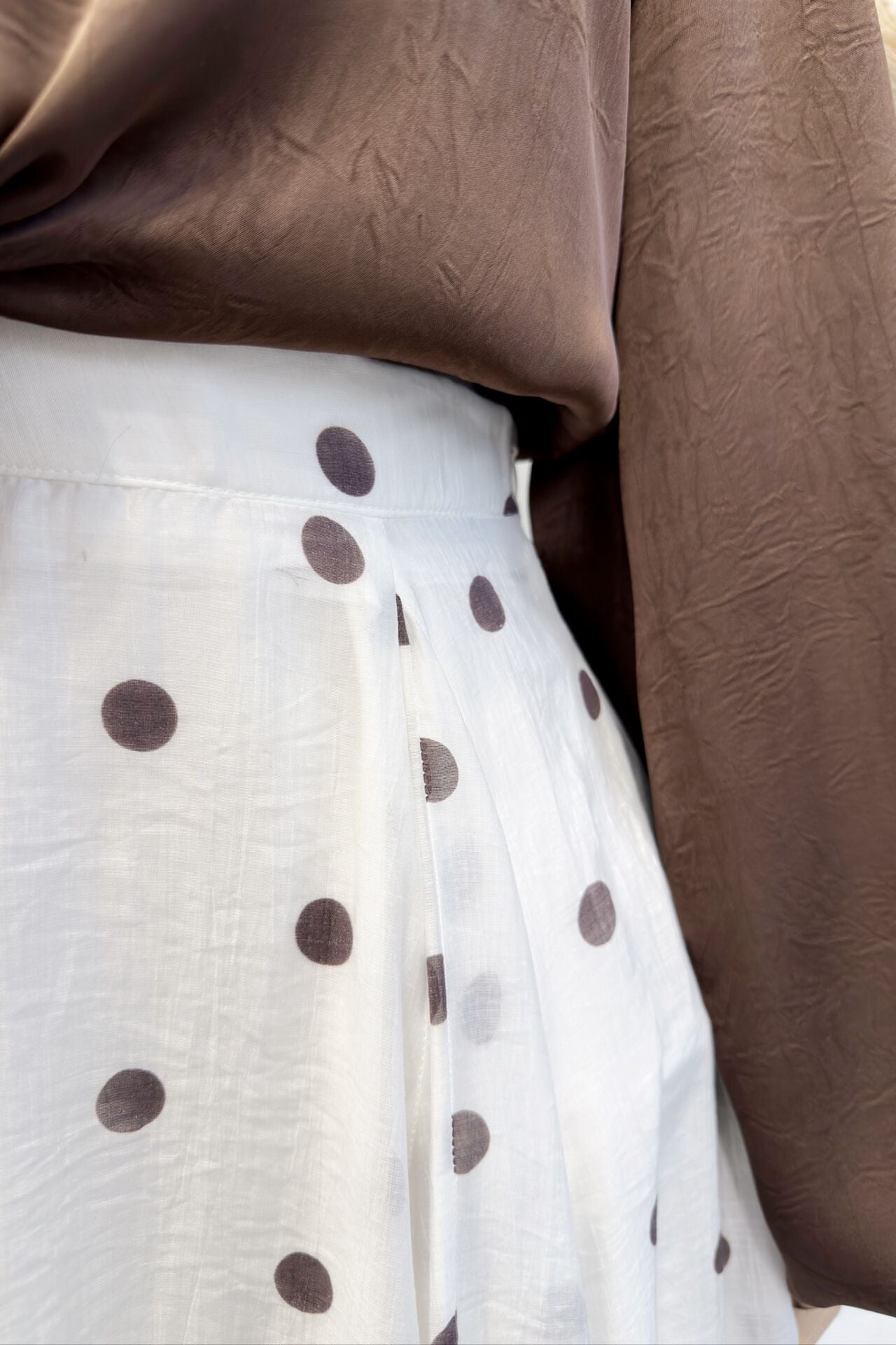 Krem Puantiye Desenli Şifon Etek