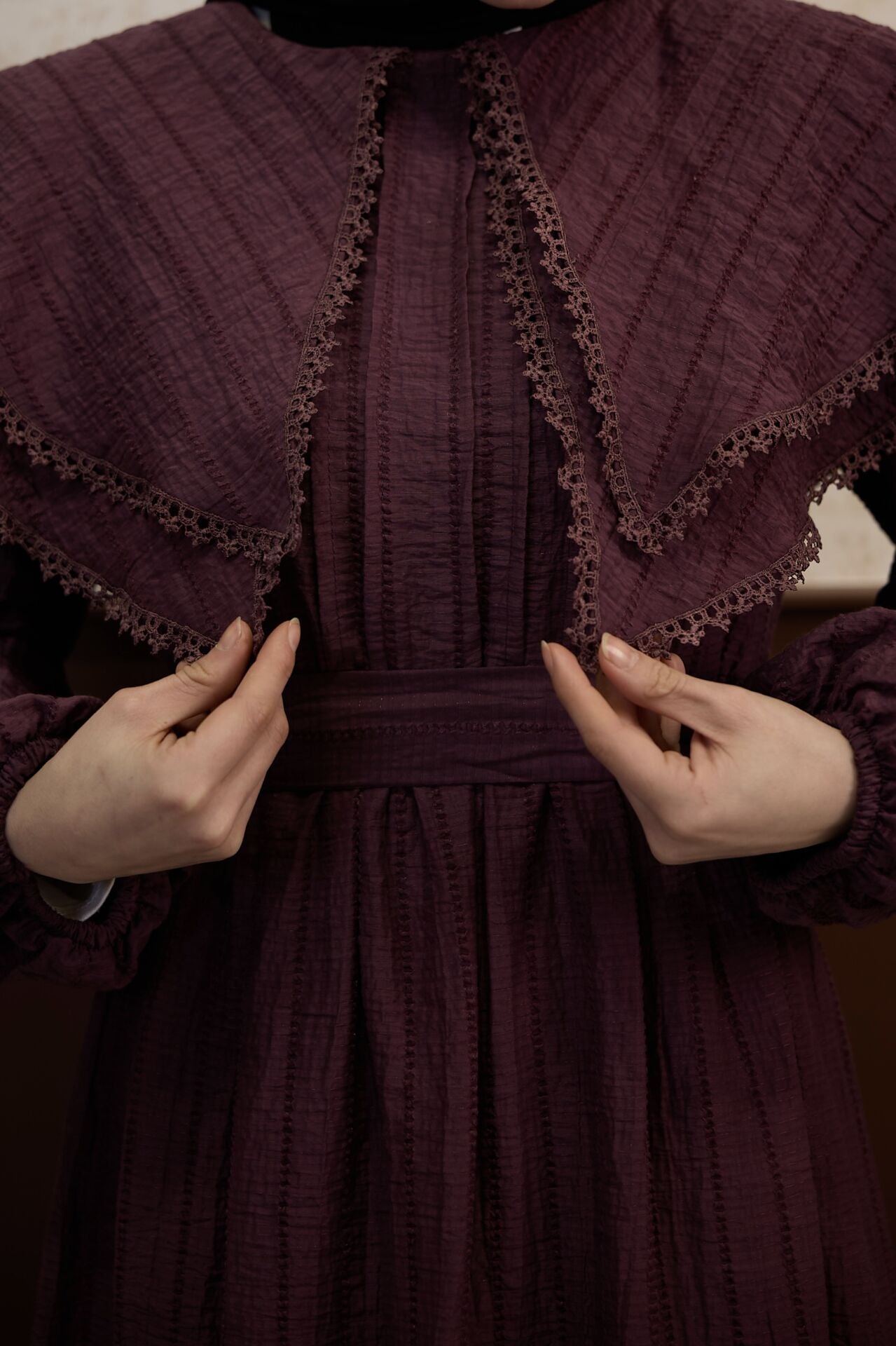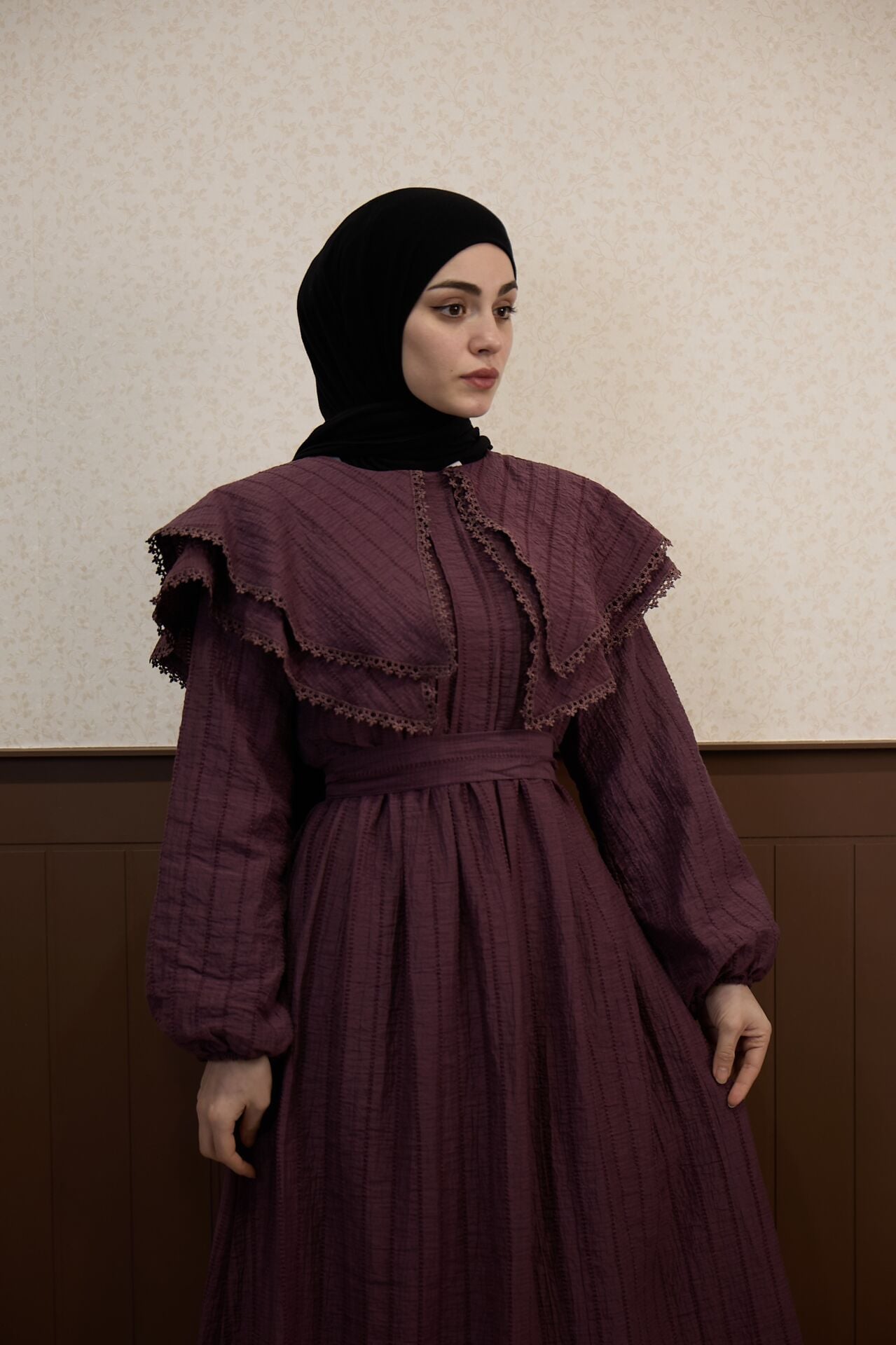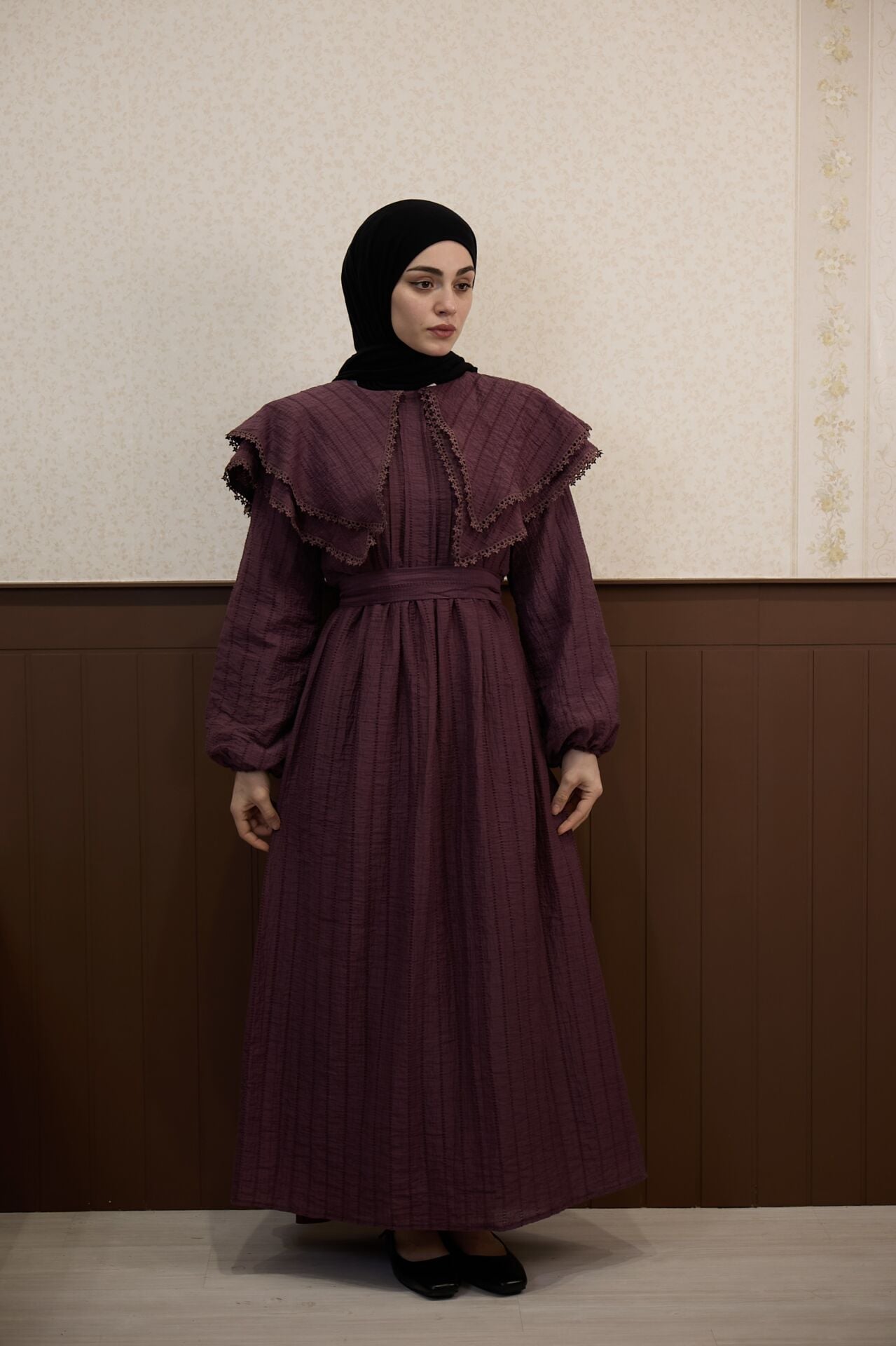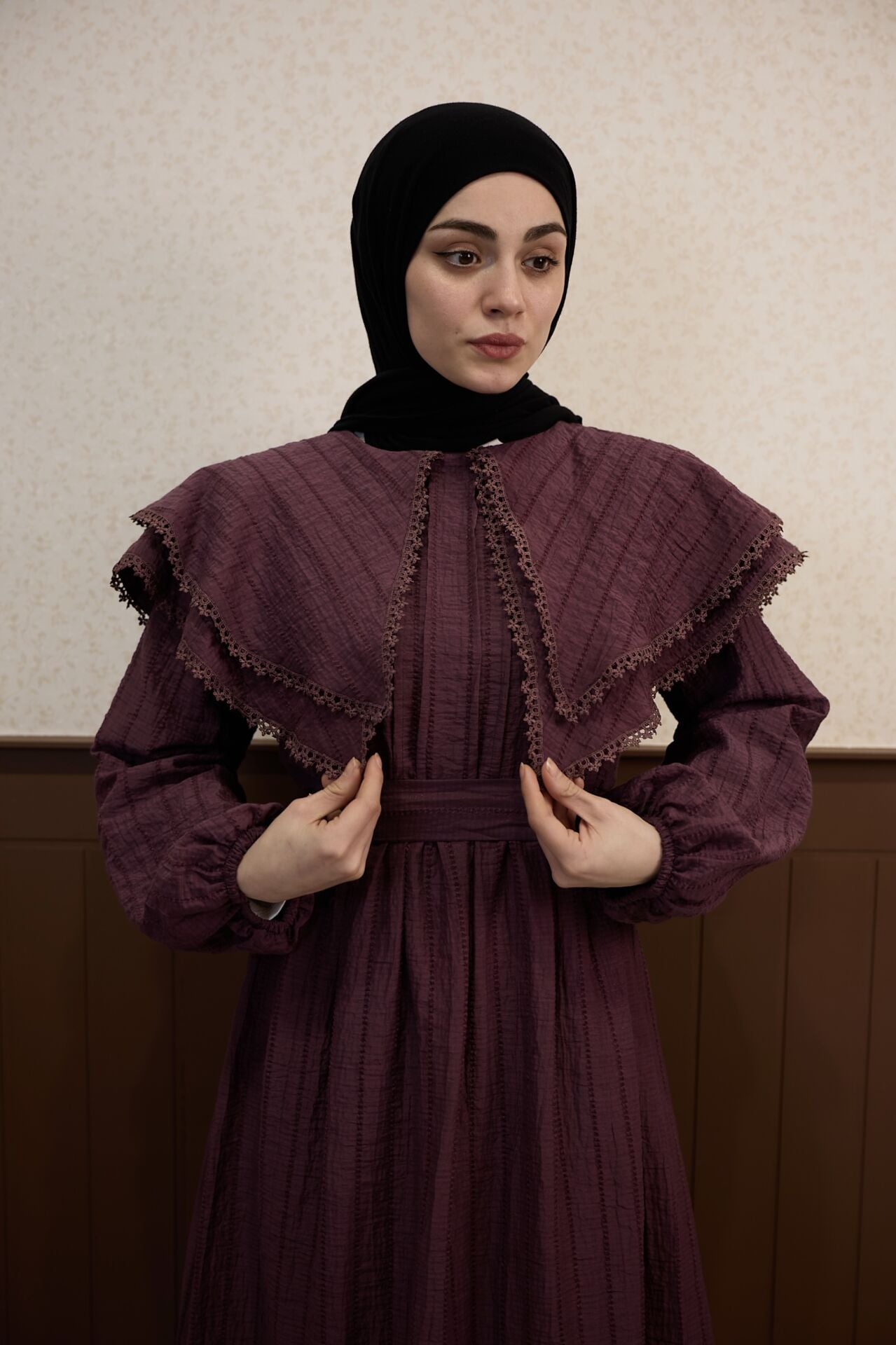 Mürdüm Pelerin Yakalı Elbise