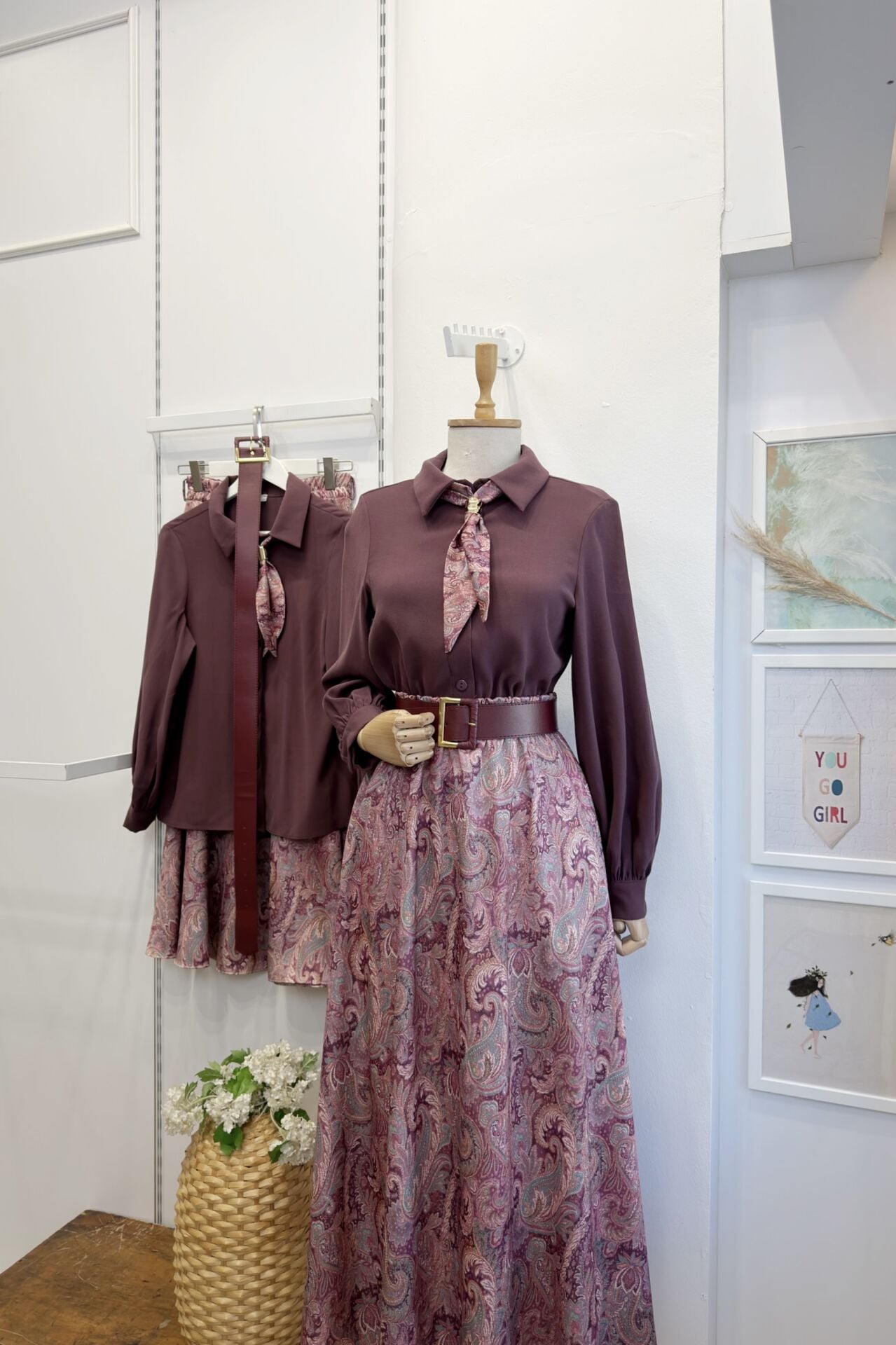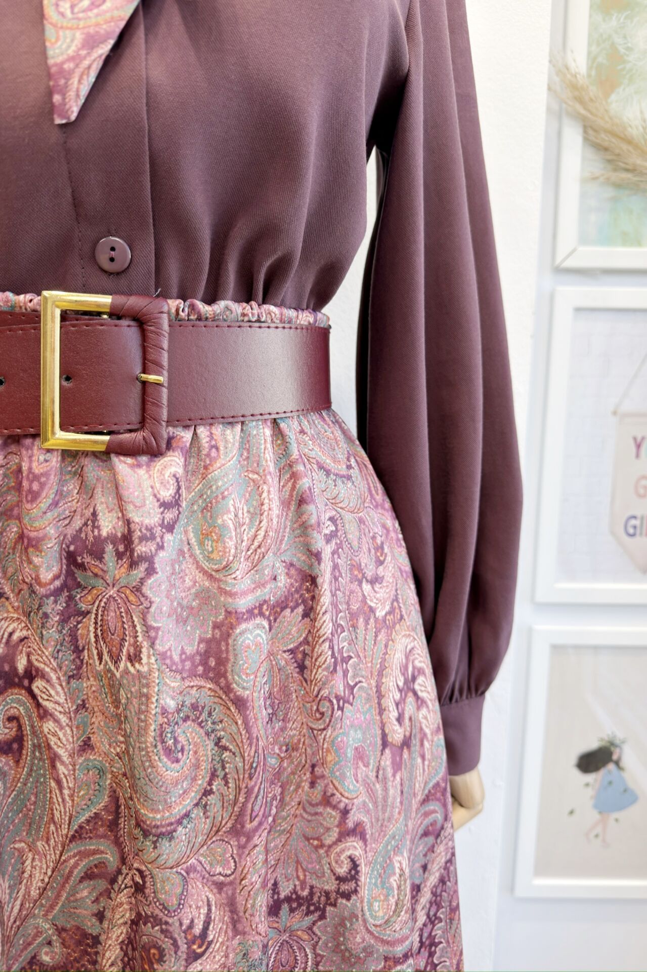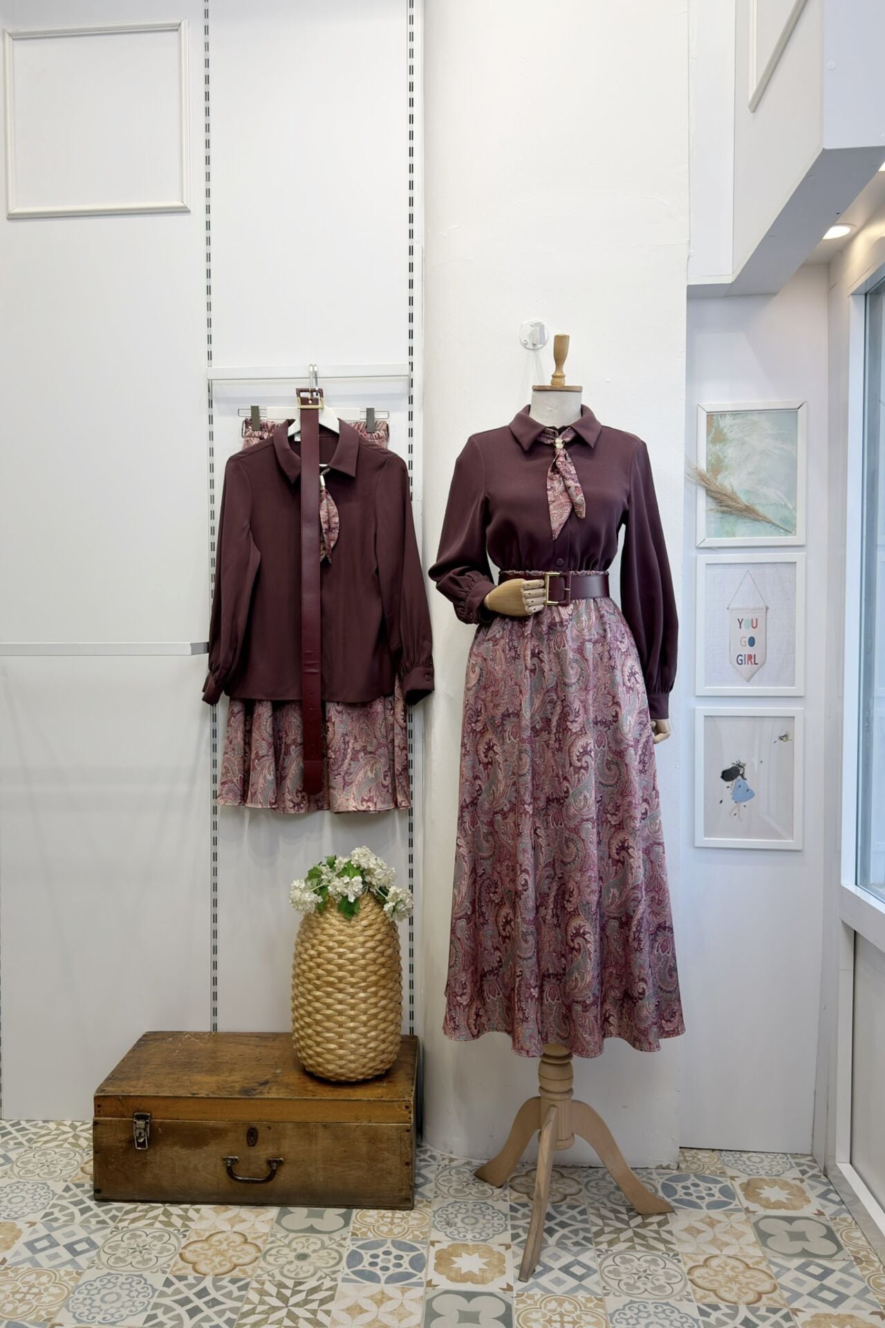 Mürdüm Saten Desenli Etekli Clemence Takım