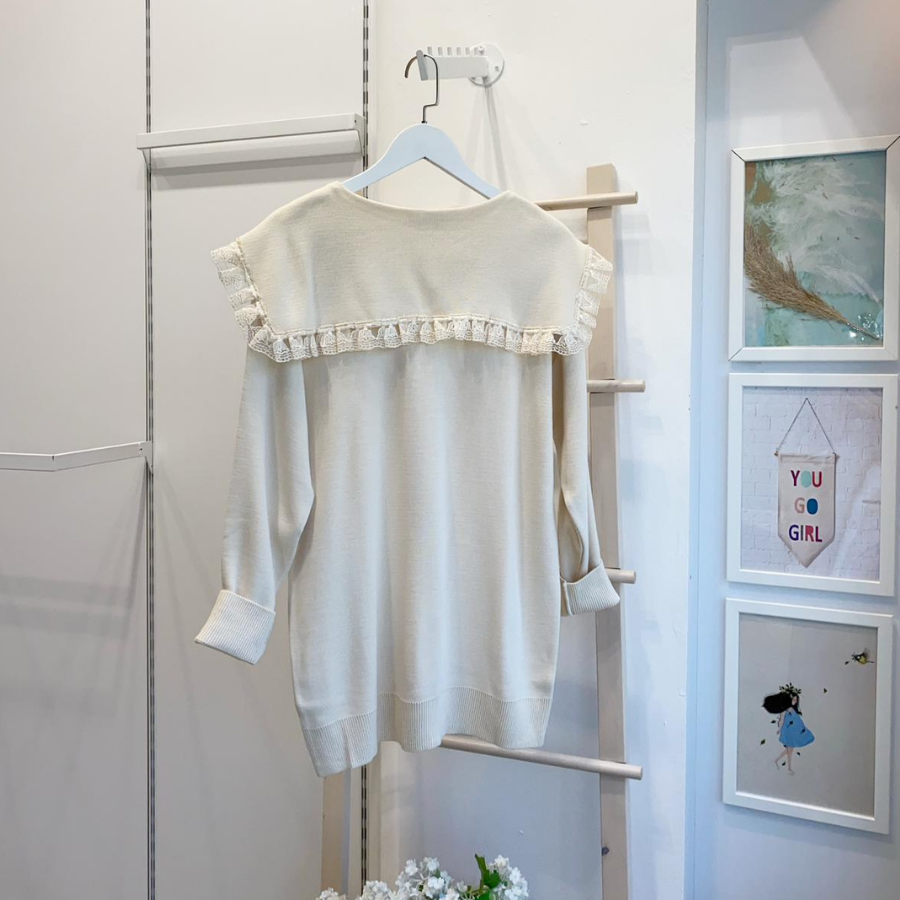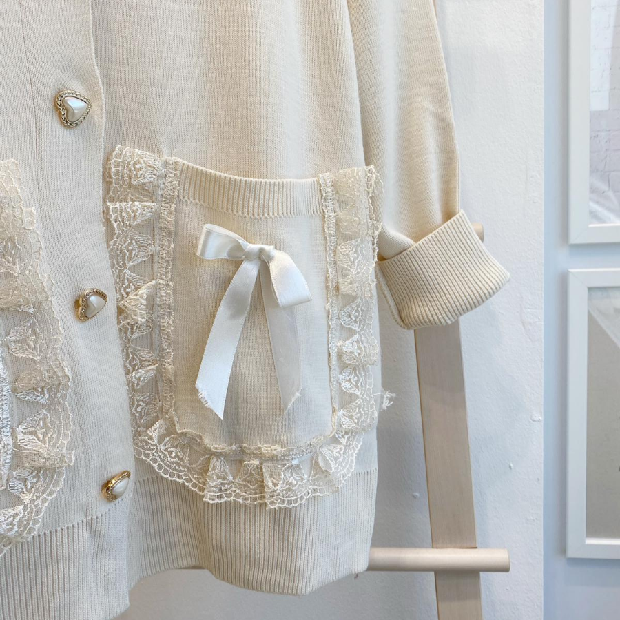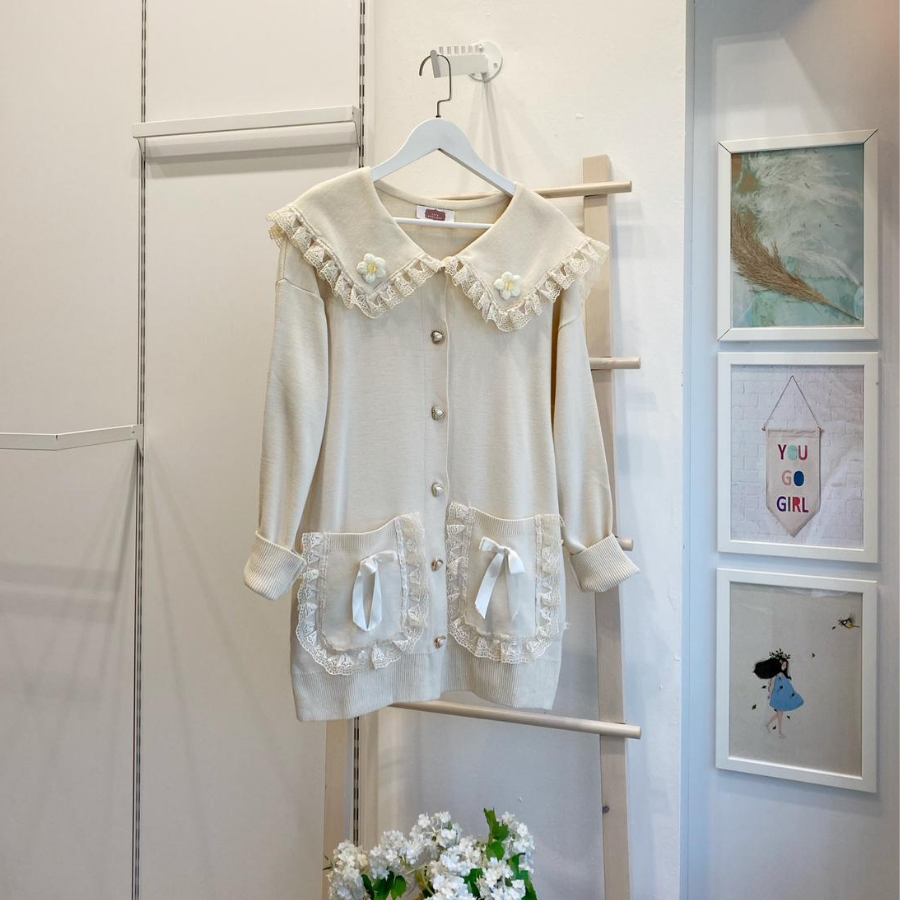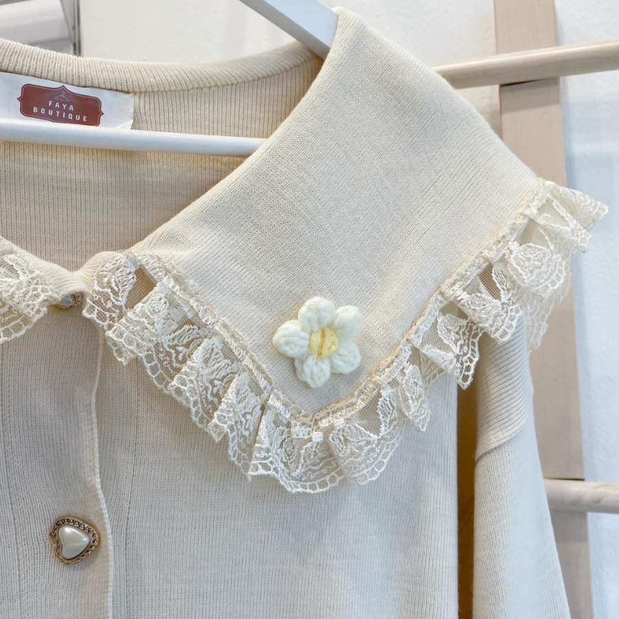 Papatya Motifli Dantel Detaylı Krem Hırka