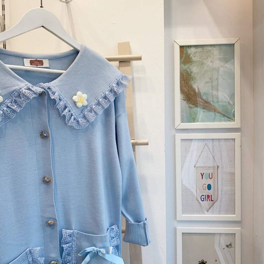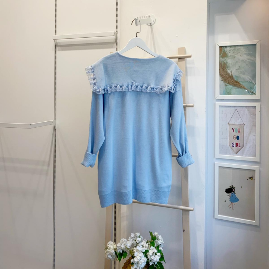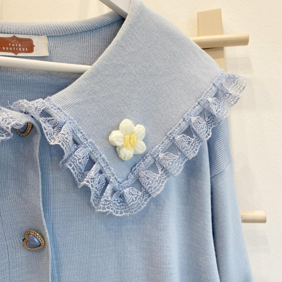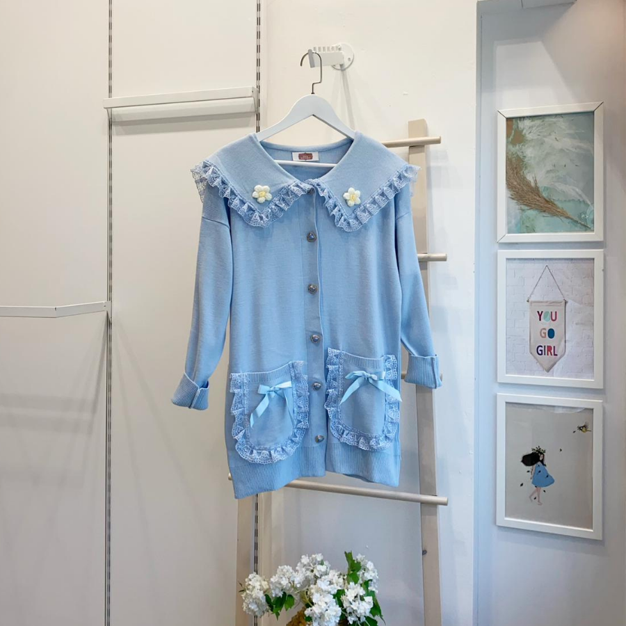 Papatya Motifli Dantel Detaylı Mavi Hırka