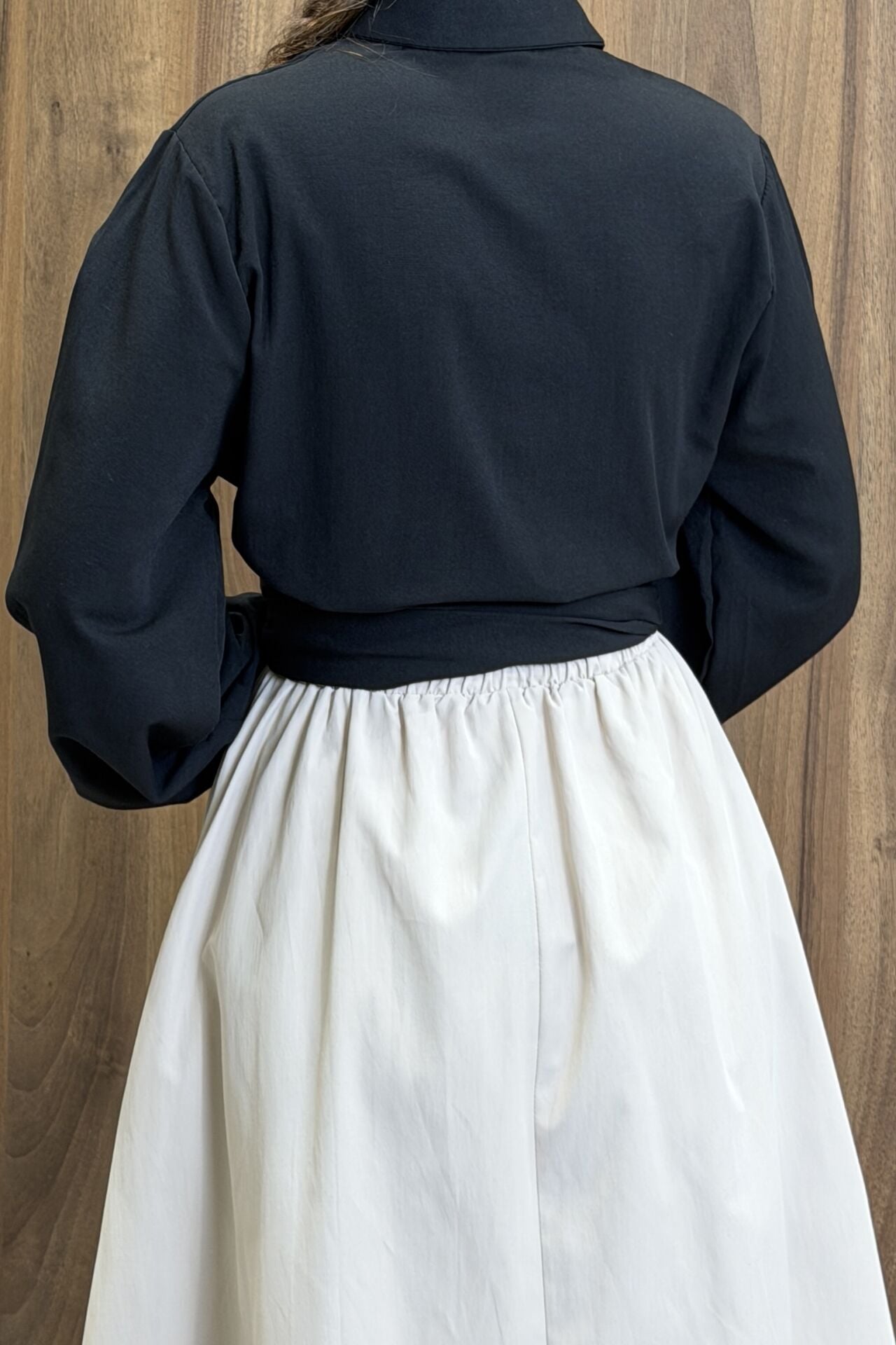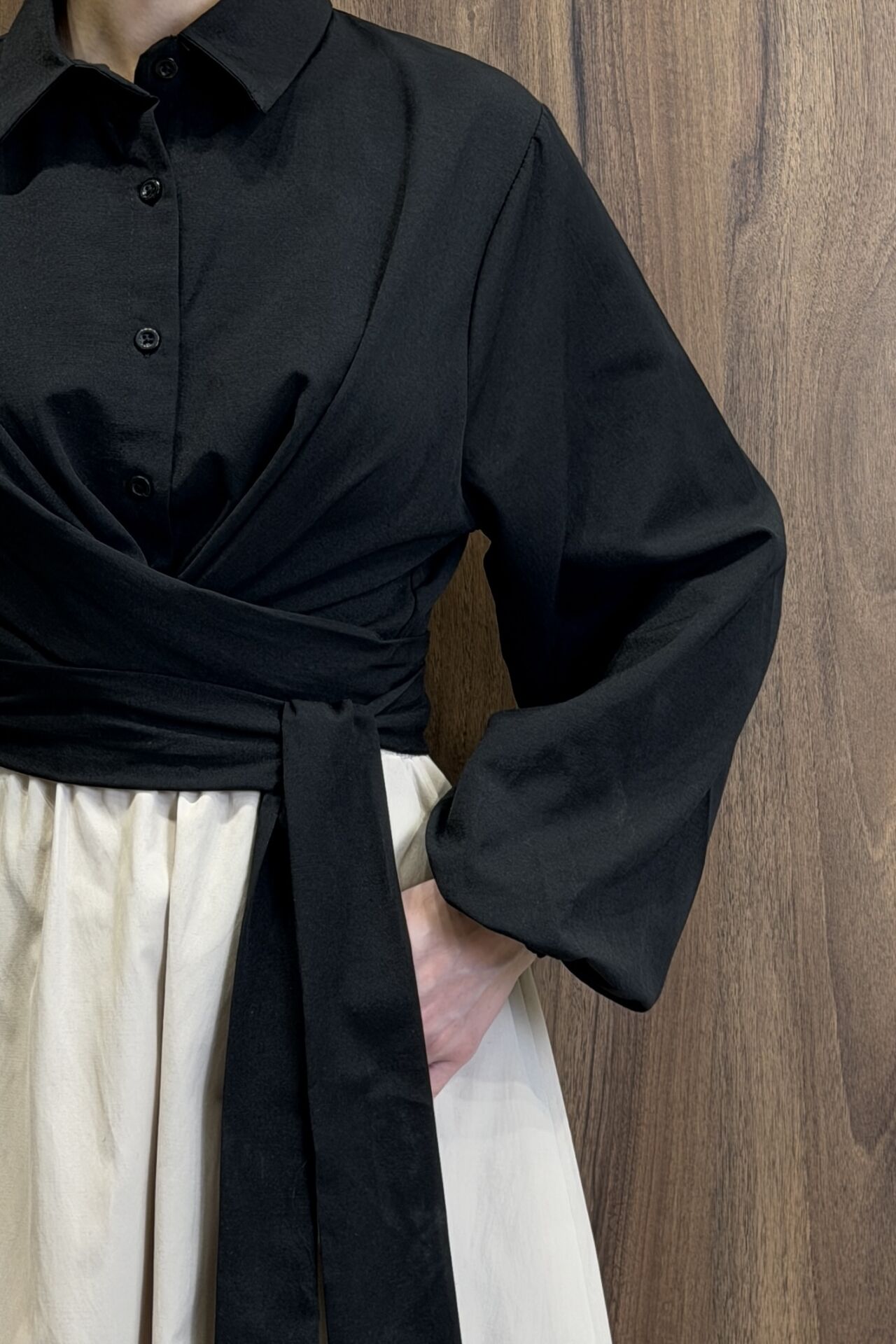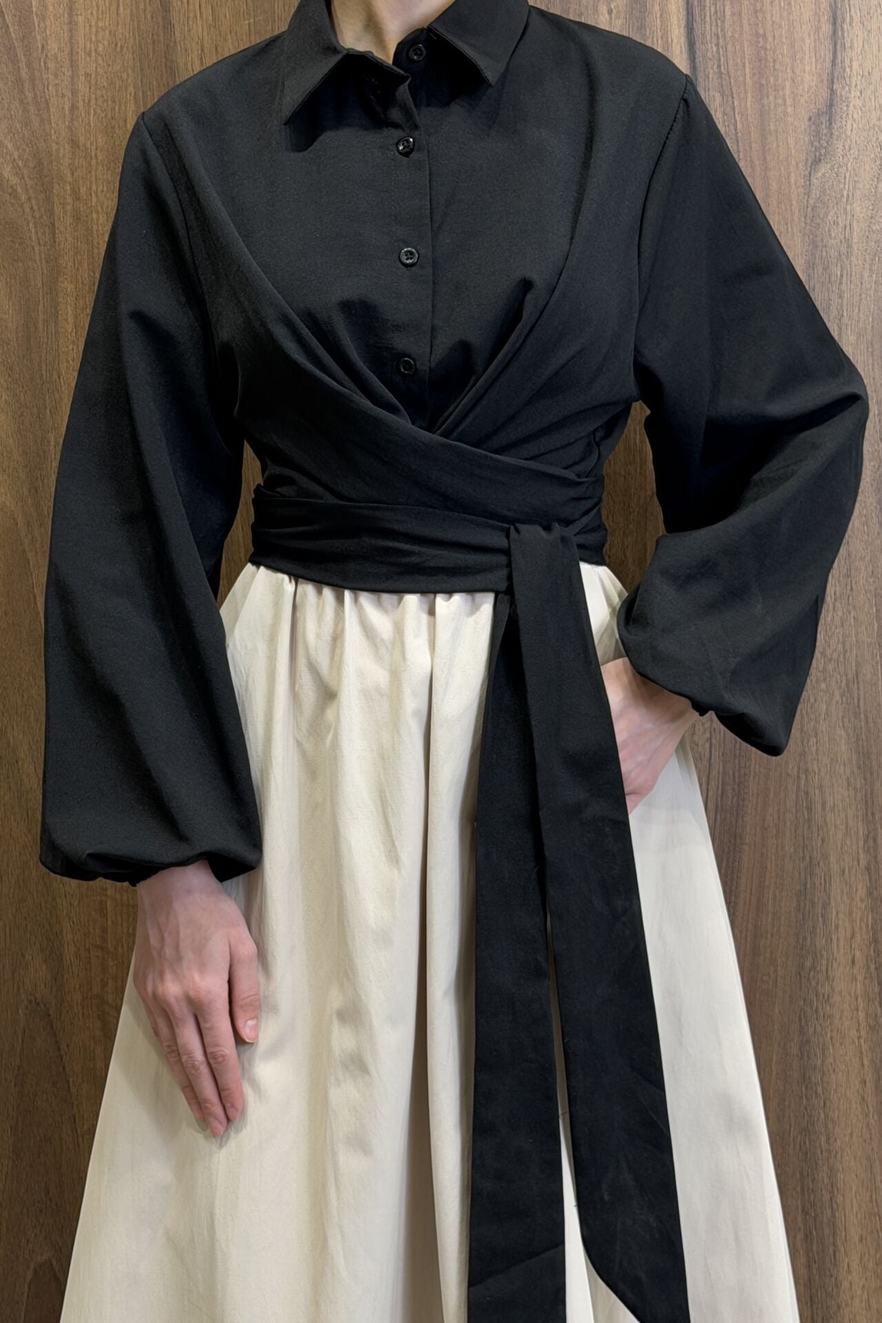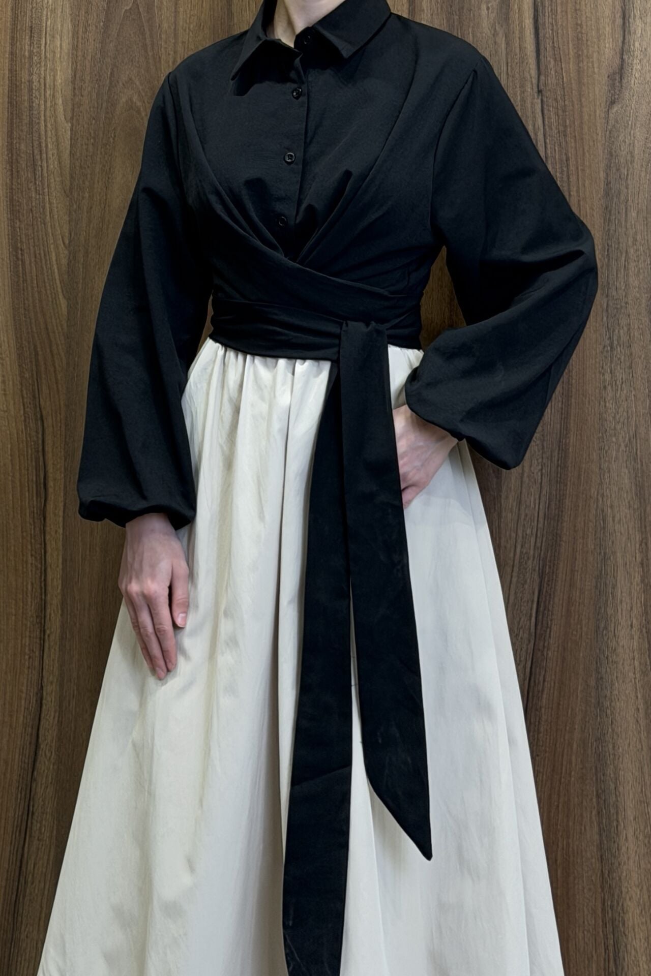 Siyah Poplin Kumaş Kuşaklı Gömlek