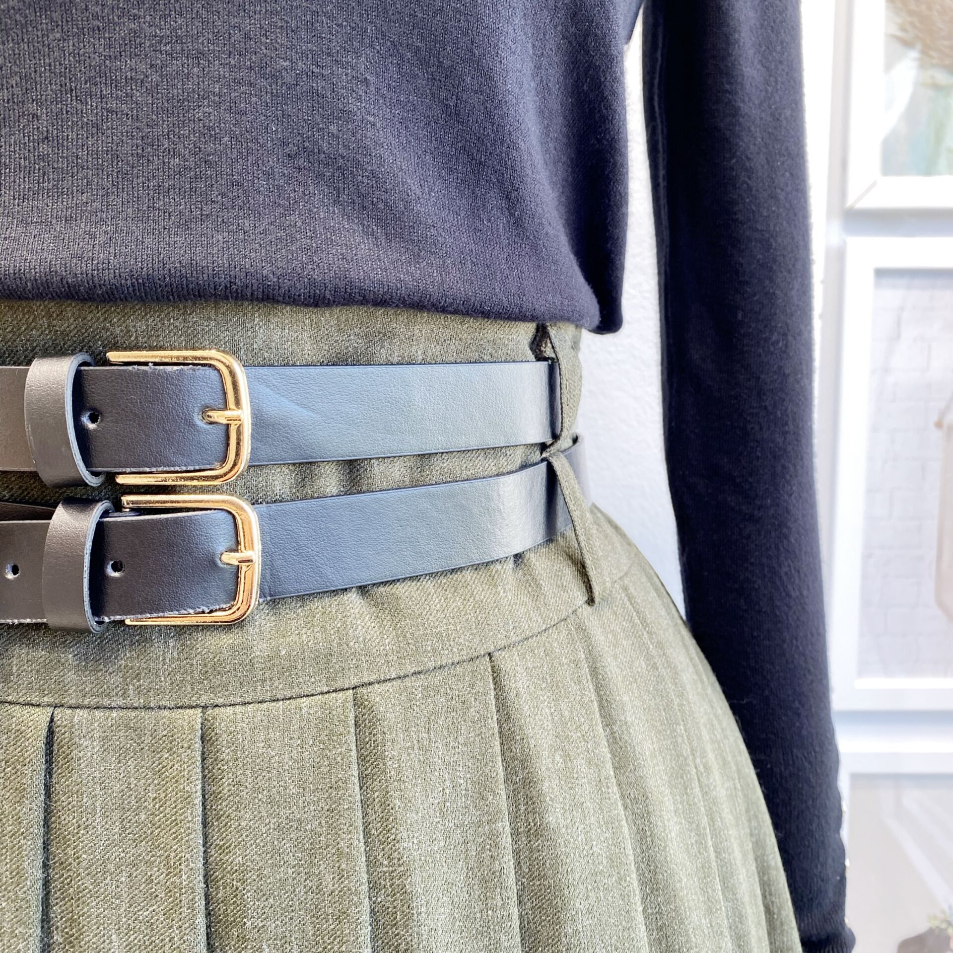 Yeşil Çift Kemerli Yün Efekt Etek