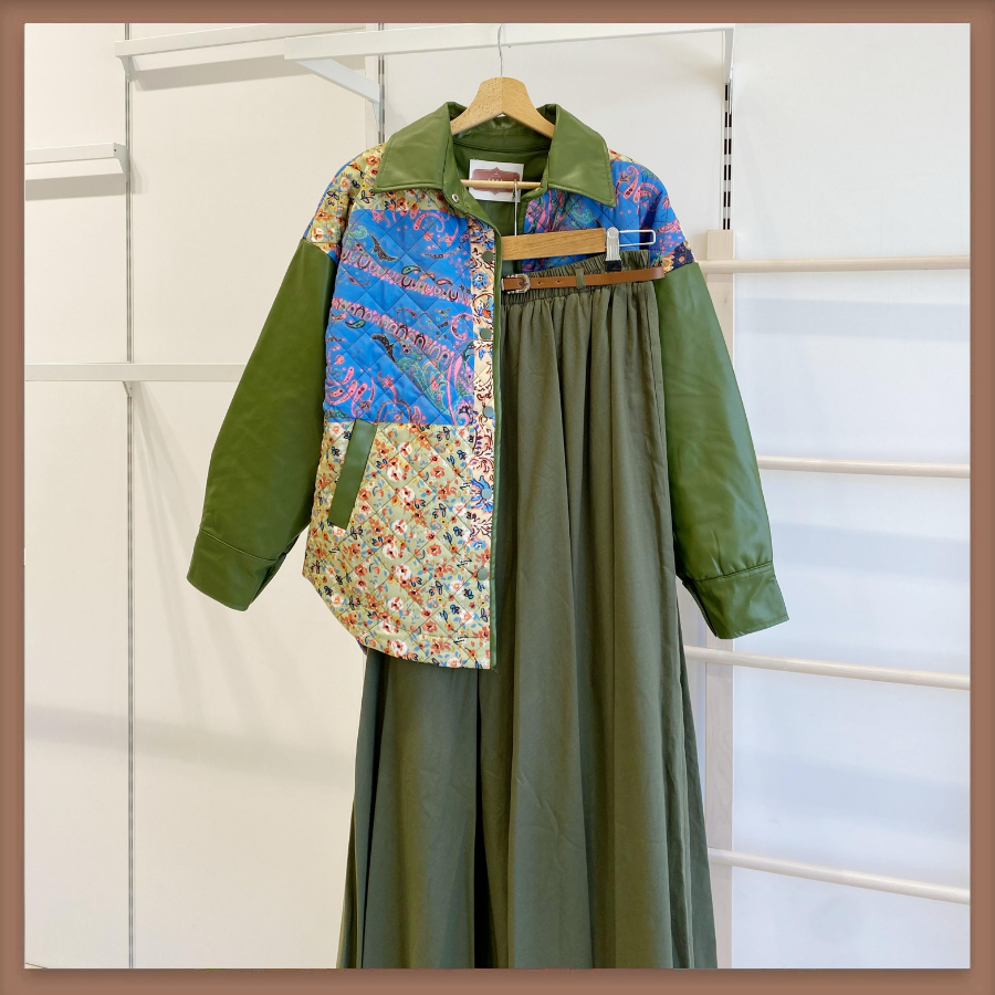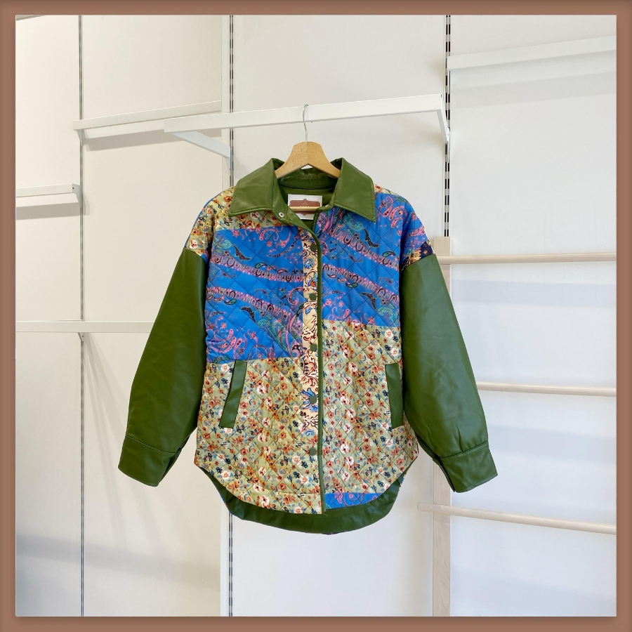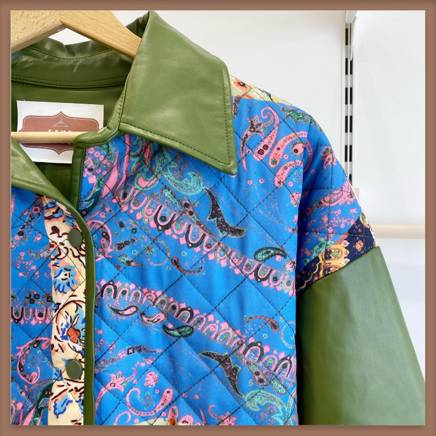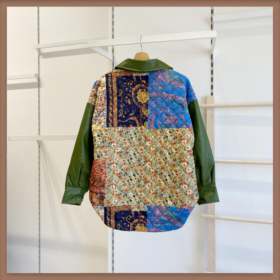 Yeşil Deri Detaylı Patchwork Kapitone Mont