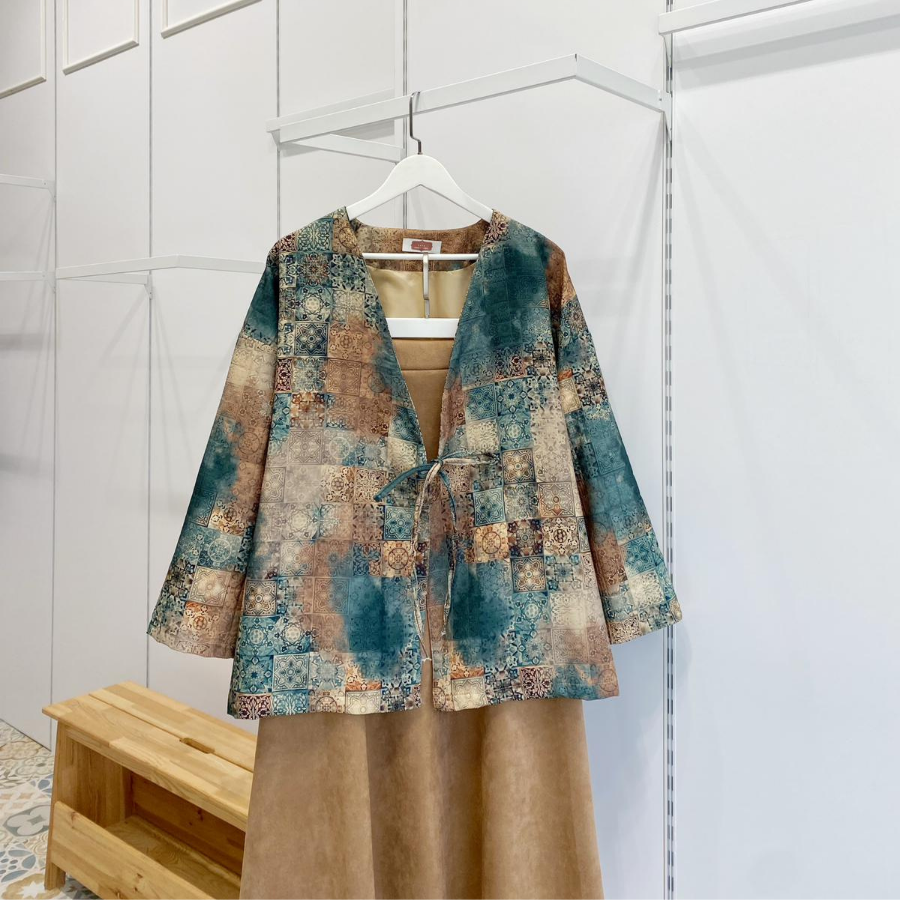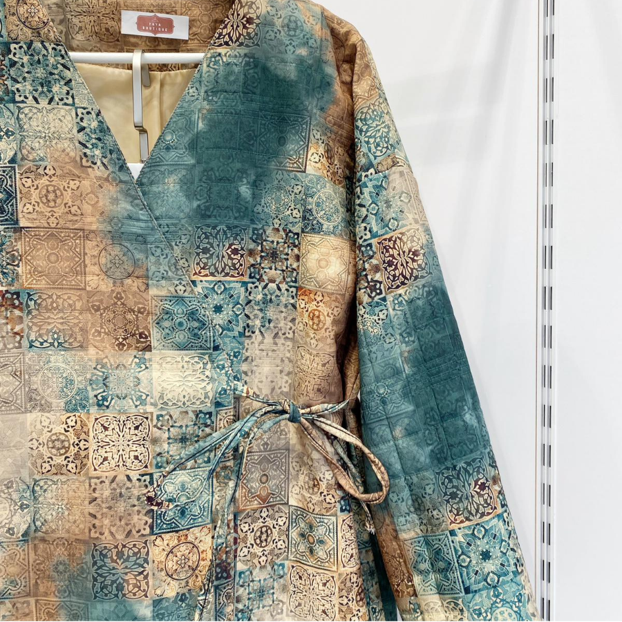 Yeşil Patchwork Desenli Anvelop Bağlamalı Ceket